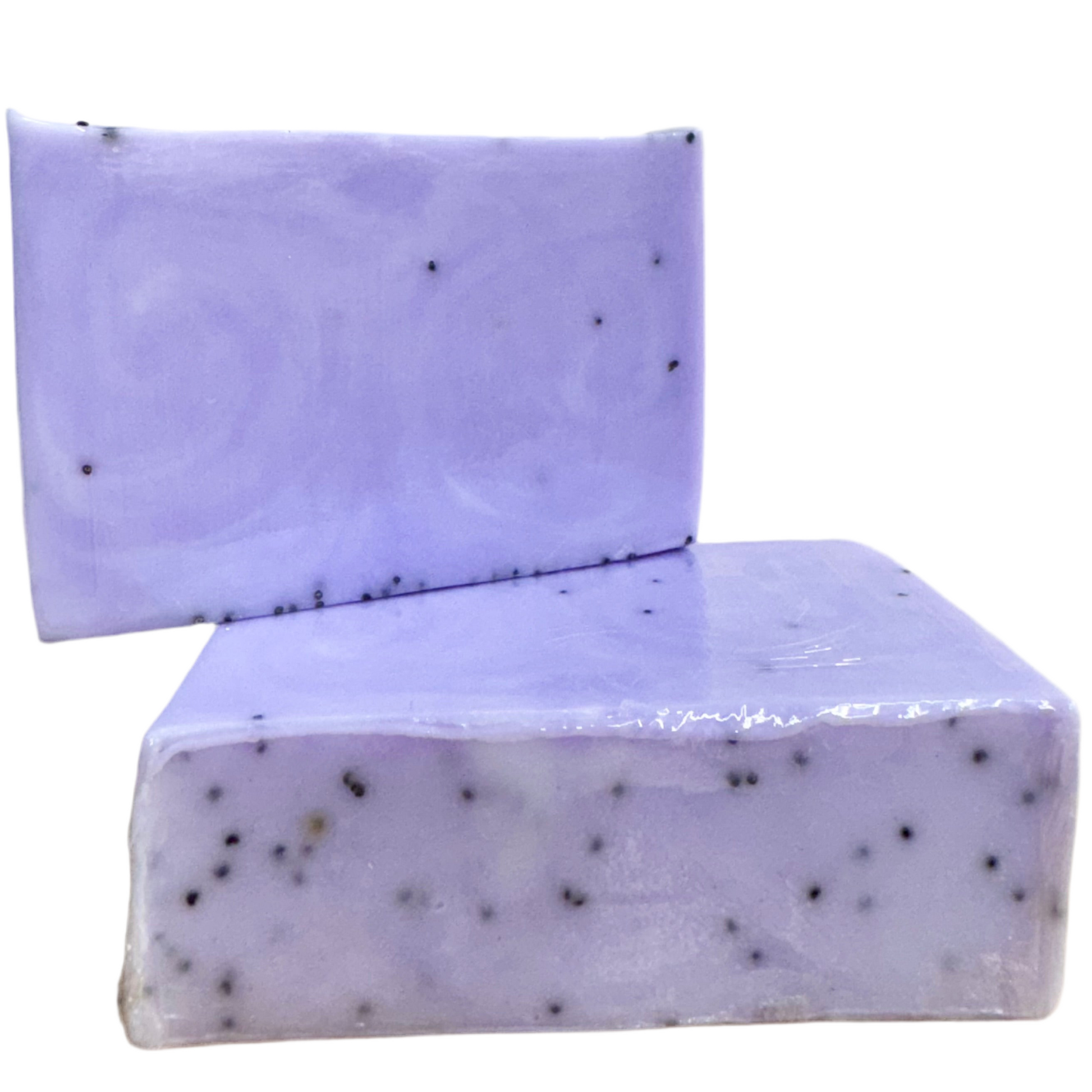 Ingredients: Sorbitol, Sodium Cocoate, Propylene Glycol, Sodium Stearate, Glycerin, Goat Milk, Lavender Essential Oil, Poppyseeds, Titanium Dioxide, Mica