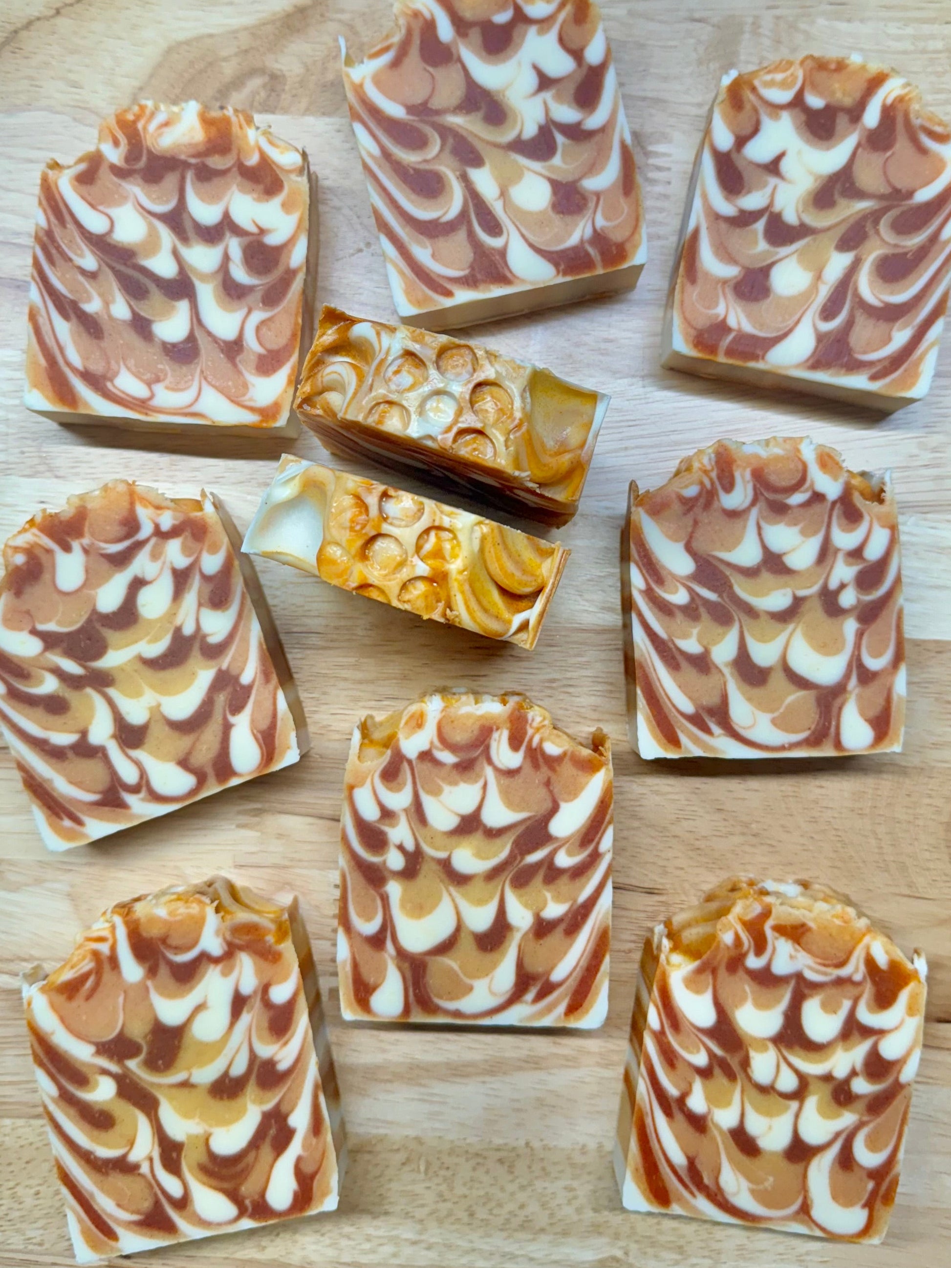 Ingredients: Pure Olive Oil, Coconut Oil, Water, Organic & Sustainably Sourced Palm Oil, Sodium Hydroxide, Castor Seed Oil, Sweet Almond Oil, Fragrance Oil, Turmeric, Colloidal Oats, Kaolin Clay, Honey